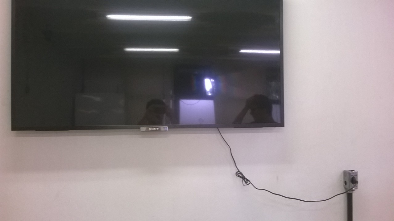 Ligar a fonte do aparelho na tomada logo abaixo da tomada da TV. A outra ponta será ligada na entrada de energia do aparelho, que fica na ponta direita da parte traseira do mesmo.